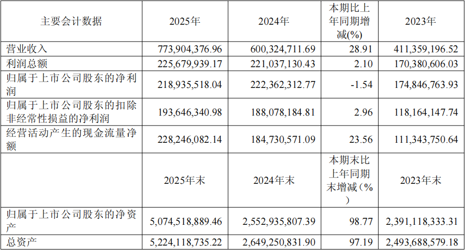 截至2025年末,公司总资产为52.24亿元,同比增长97.19%;归属于上市公司股东的净资产为50.75亿元,同比增长98.77%;资产负债率为2.86%。经营活动产生的现金流量净额为2.28亿元,同比增长23.56%。报告期内,公司发行21,556,000股H股,募集资金净额用于补充公司全球化发展资金需求。