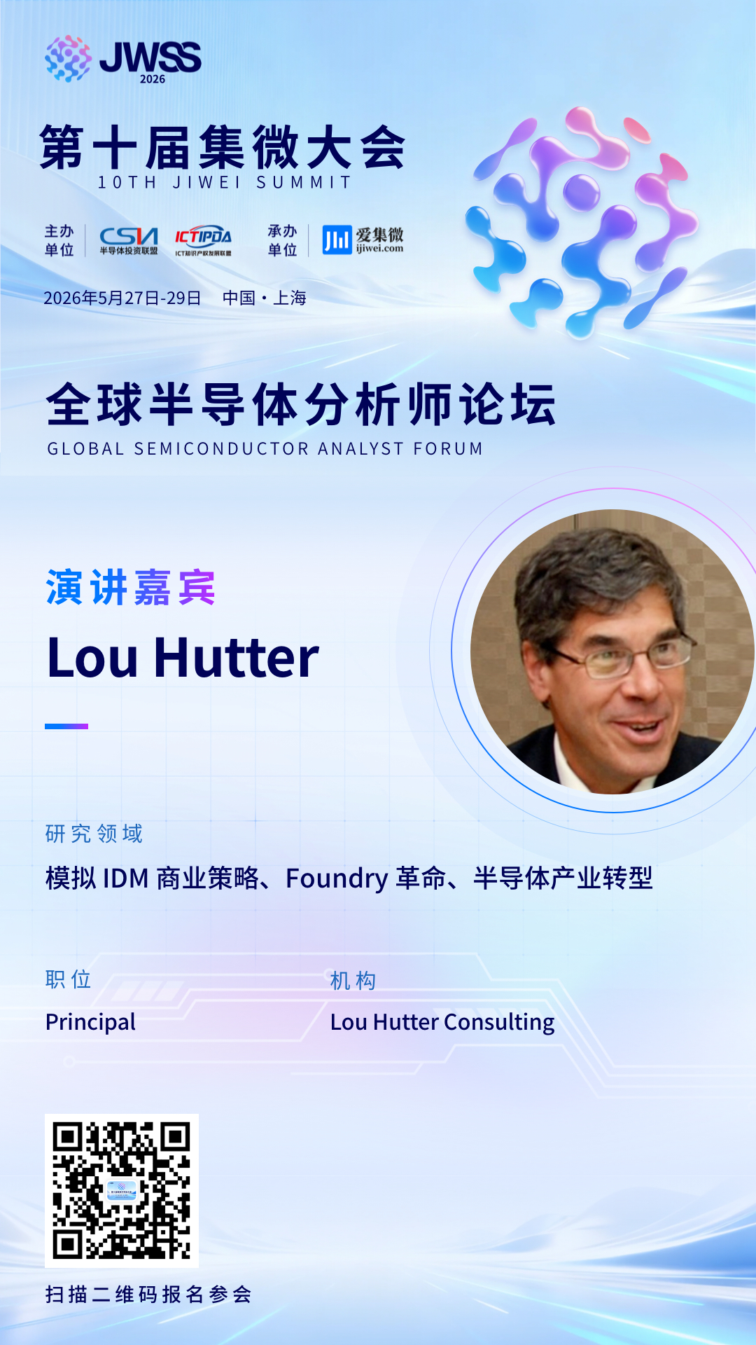我们非常荣幸地宣布,Lou Hutter Consulting创始人Lou Hutter确认出席,并带来题为《跨越代工革命:模拟IDM在产业变局中的新战略、技术重心与市场卡位》的专业分享。