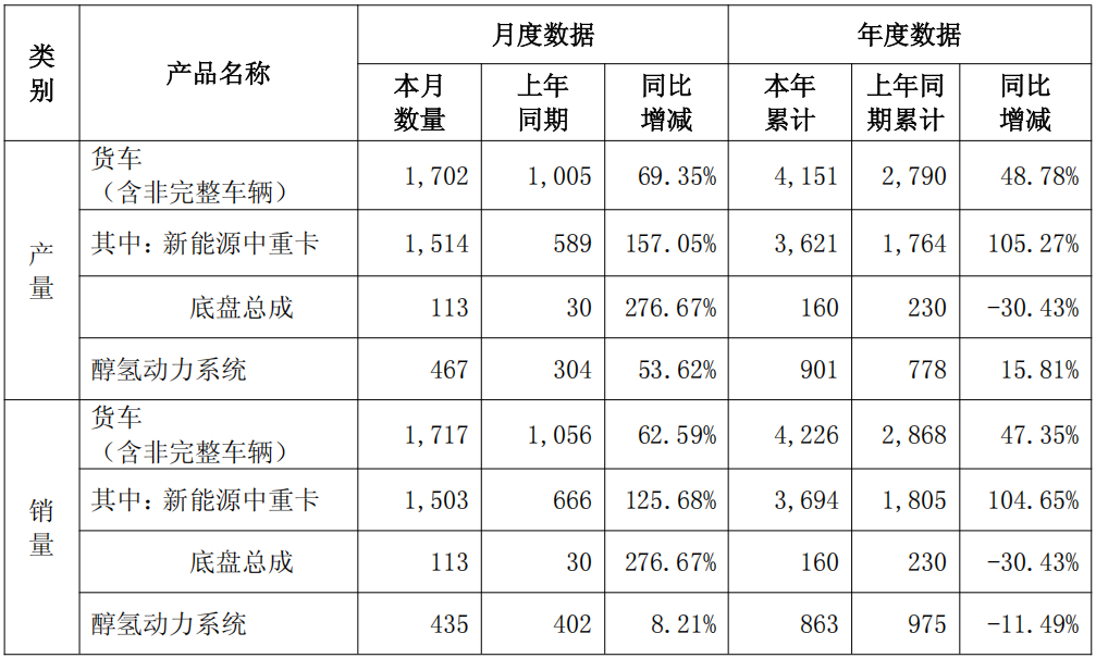 汉马科技3月销售汽车1717辆,新能源中重卡产销同比增幅均超100%
