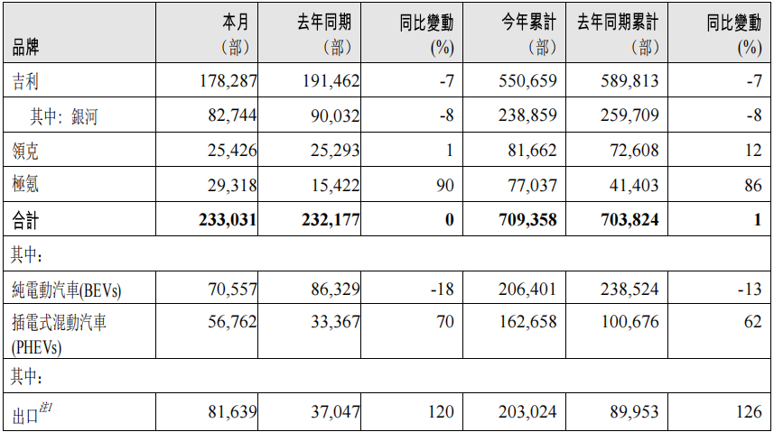 从累计数据看,本集团今年前三个月累计销量为709,358部,较去年同期的703,824部增长1%。其中,极氪品牌累计销量为77,037部,同比增长86%。