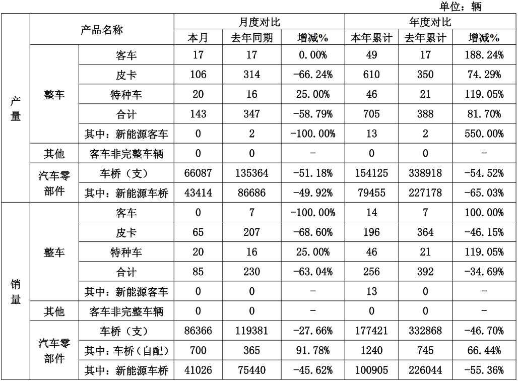 在新能源汽车方面,3月新能源客车销量为0辆;本年累计销量为13辆,去年同期累销为0辆。