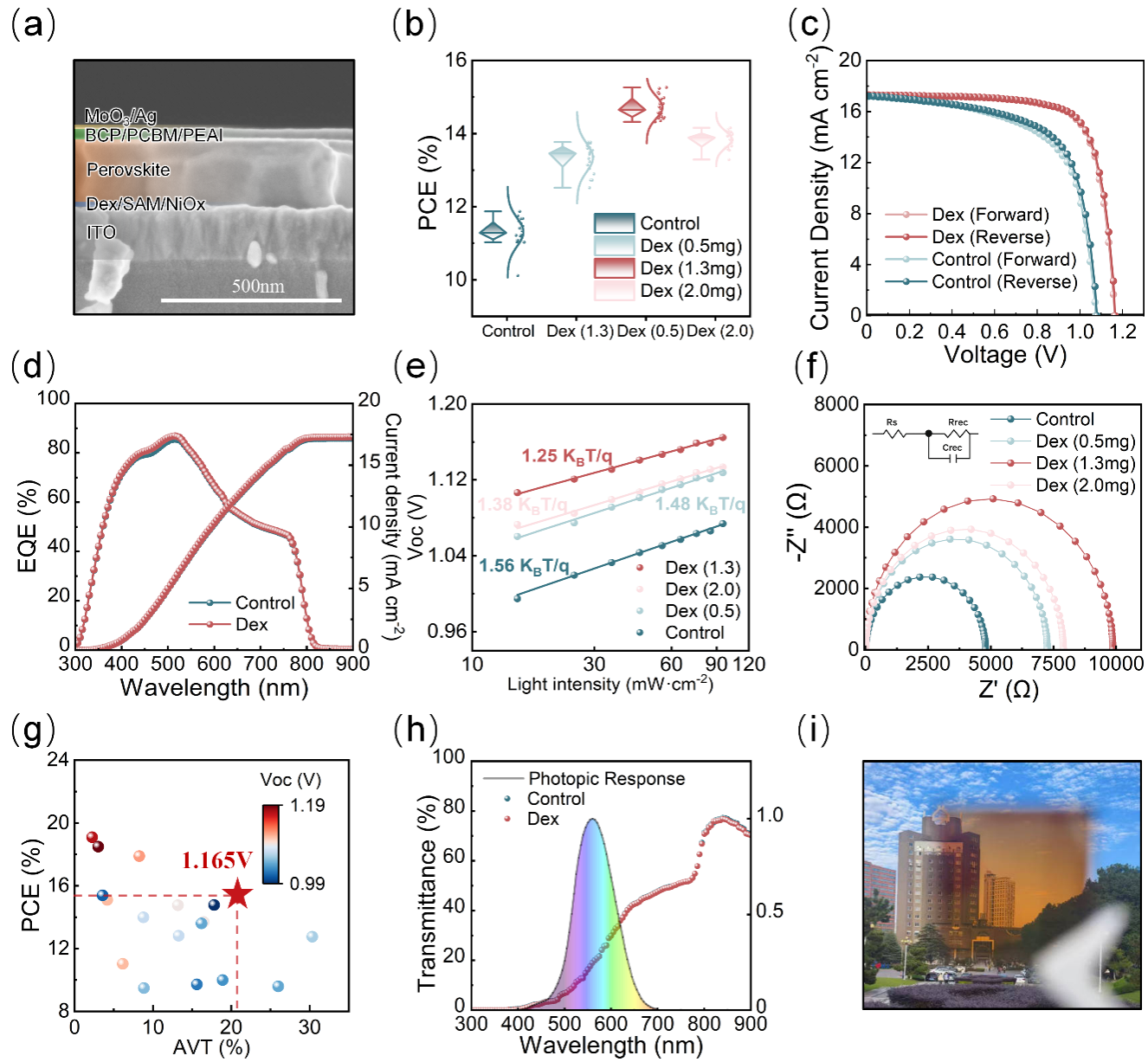 图2.半透明钙钛矿太阳能电池的器件性能与透光特性