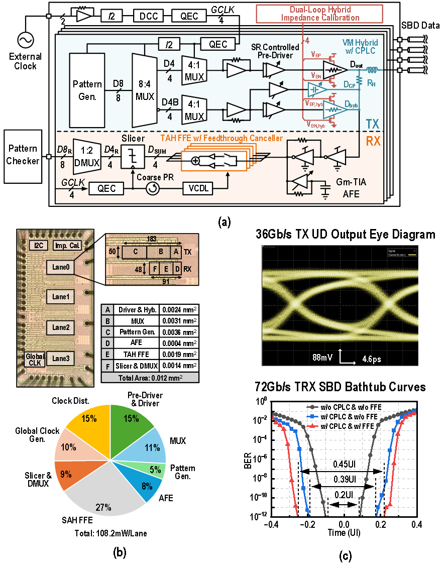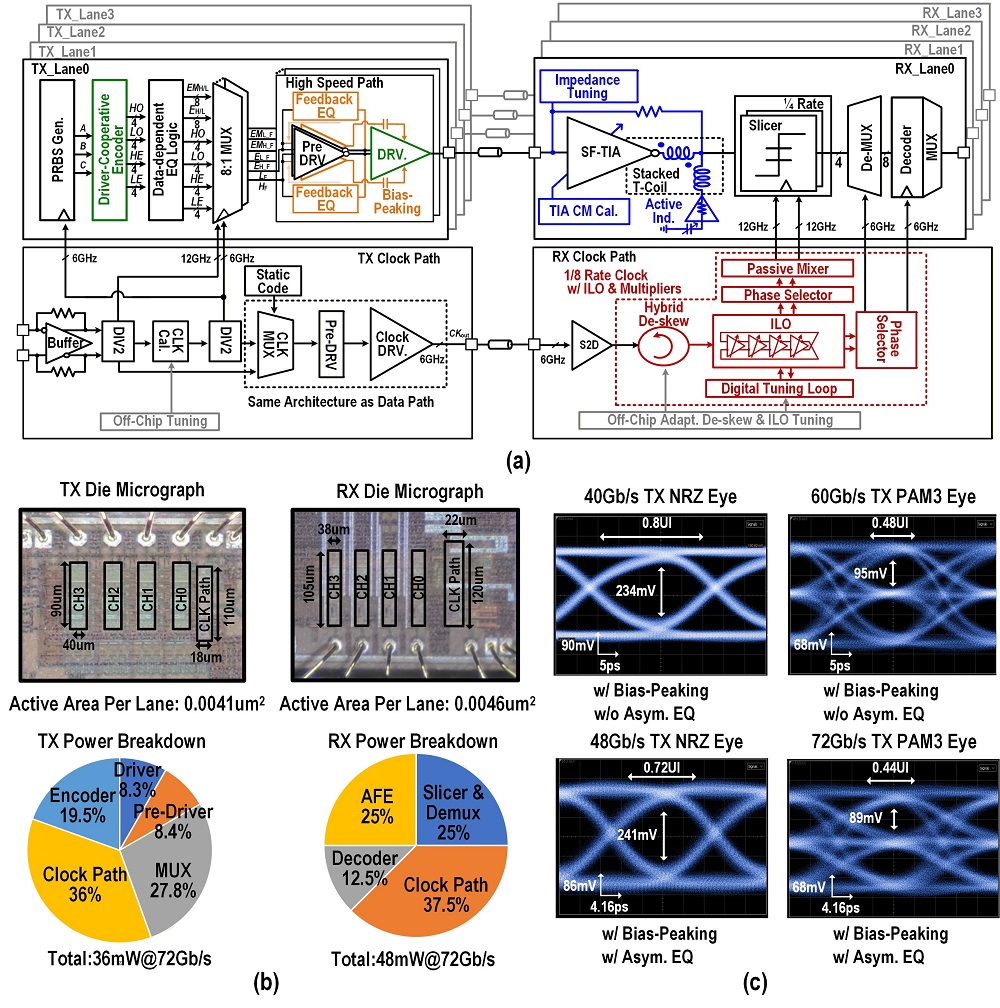 随着人工智能与云计算应用的快速发展,芯粒互连与存储接口需要在有限功耗下实现更高的数据吞吐能力,这推动了高速、低功耗单端有线收发机的持续演进。近年来,PAM3信令因其相较NRZ可提供1.5倍带宽效率、且相较PAM4具有更好的噪声与串扰容限,正成为新一代高密度短距互连的重要候选方案。然而,PAM3信号对码间干扰更为敏感,不同跳变边沿之间的切换抖动也会导致眼宽收缩和信号完整性恶化。针对这一问题,南方科技大学团队提出了一款面向芯粒与存储接口的72Gb/s/pin单端PAM3收发机。该设计采用驱动协同编码与阻抗校准跨阻放大器终端协同优化,在提升信号完整性的同时将信令功耗降低46%;进一步通过预加重非对称数据相关均衡与bias-peaking技术,有效缓解PAM3不同边沿的ISI与切换抖动,将眼图面积分别提升1.9倍和2.8倍。此外,论文还提出了1/8速率前向时钟倍频方案,实现了低功耗、宽范围的去偏斜操作。测试结果表明,该收发机在28nm CMOS工艺下实现了72Gb/s/pin的数据速率,在48Gb/s和72Gb/s下的能效分别达到0.7pJ/b和1.17pJ/b,展现出面向下一代高带宽、低功耗存储与芯粒互连系统的应用潜力。图3展示了存储器接口芯片的电路架构图,功耗分布图以及芯片结果。