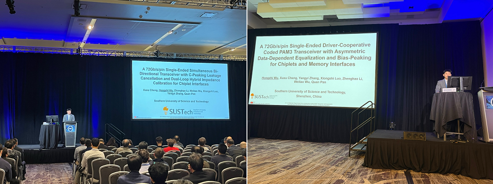 ISSCC被学术界和工业界公认为集成电路设计领域的最高水平会议,享有“芯片奥林匹克大会”之美誉。该会议始于1953年,历来是国际最尖端集成电路技术的首发平台,每年吸引超过3000名来自全球工业界与学术界的参会者,每篇录用的论文均代表了芯片领域最前沿的研究成果。南方科技大学微电子学院潘权课题组今年入选的两篇论文的标题分别为:《A 72Gb/s/pin Single-Ended Simultaneous Bi-Directional Transceiver with C-Peaking Leakage Cancellation and Dual-Loop Hybrid Impedance Calibration for Chiplet Interfaces》和《A 72Gb/s/pin Single-Ended Driver-Cooperative Coded PAM3 Transceiver with Asymmetric Data-Dependent Equalization and Bias-Peaking for Chiplets and Memory Interfaces》,其中后者被评选为亮点论文(Highlighted Papers)。