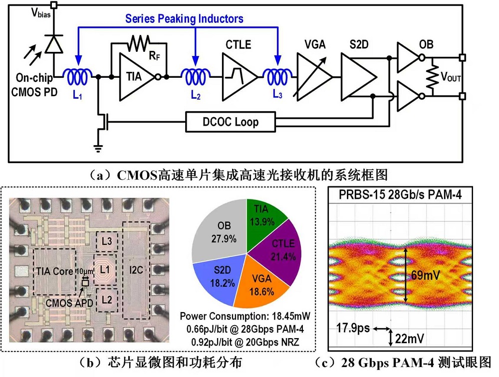团队从光器件和接收机前端电路入手,基于28-nm CMOS工艺实现了一款面向VCSEL光链路应用的28 Gb/s PAM-4接收机该芯片将PD和跨阻放大器电路集成在一块芯片上,在CMOS工艺上实现了单片集成方案。芯片采用10um×10um受光面积的PD,通过横向插指和浅沟隔离等技术突破了CMOS PD带宽、响应度低等技术瓶颈。同时,在跨阻放大器电路中采用全反相器设计,并插入精心设计的级间电感,显著降低功耗和带内噪声。该研究为低成本、低功耗的高速光接收机设计提供了一种具有实用价值的技术方案,达到了目前国内外CMOS全集成光接收机的最高速率。