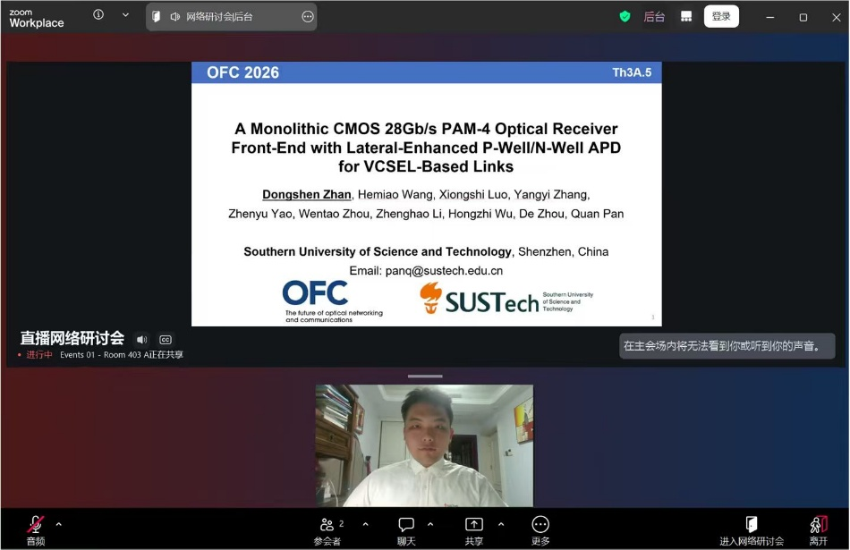论文3:D. Zhan, H. Wang, X. Luo, Y. Zhang, Z. Yao, W. Zhou, Z. Li, H. Wu, D. Zhou, and Q. Pan, "A Monolithic CMOS 28Gb/s PAM-4 Optical Receiver Front-End with Lateral-Enhanced P-Well/N-Well APD for VCSEL-Based Links," in Optical Fiber Communication Conference (OFC), Los Angeles, USA, 2026.