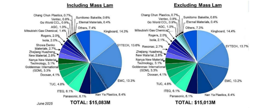 CCL即铜箔基板(又称“覆铜板”),是PCB中支撑整体结构的关键组件。去年以来,覆铜板行业在AI及汽车电子等应用领域需求的带动下,市场呈现结构性复苏态势,技术升级方向明确。 据Prismark统计,2024年全球CCL市场规模约为150亿美元,同比上升17.9%;从区域划分来看,我国占全球比例约为74.8%,同比增加1.5个百分点。