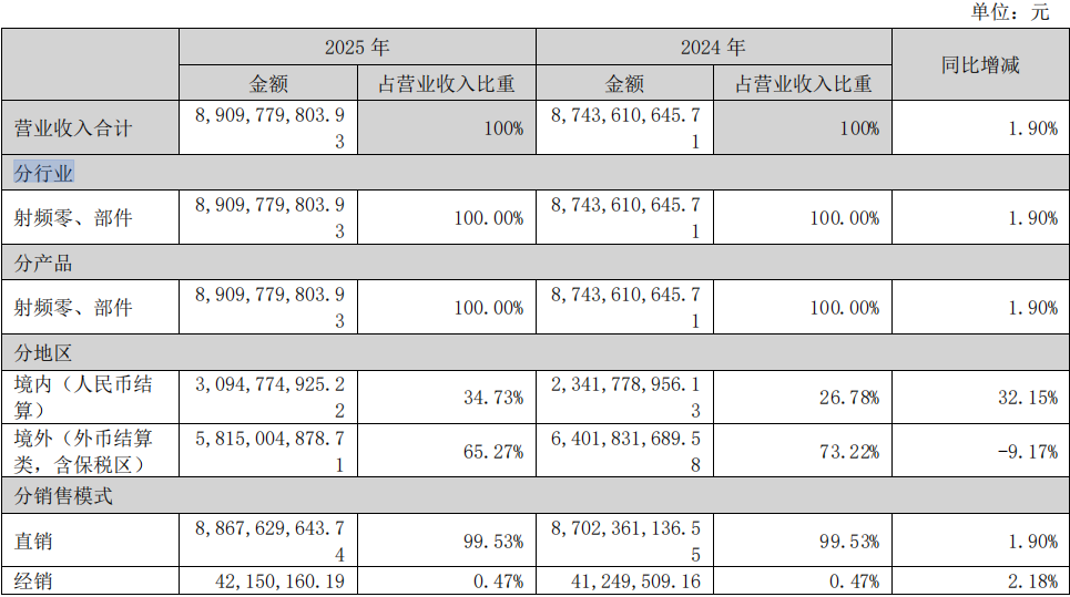 4月17日,信维通信发布2025年年度报告。报告显示,2025年度公司实现营业收入89.1亿元,较上年同期增长1.9%;归属于上市公司股东的净利润为7.09亿元,同比增长7.12%;归属于上市公司股东的扣除非经常性损益的净利润为6.43亿元,同比增长19.56%。经营活动产生的现金流量净额为16.89亿元,同比增长57.01%。