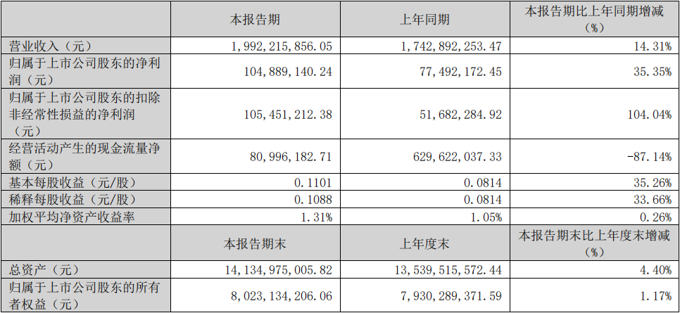 截至报告期末,公司总资产为135.4亿元,较期初增长1.26%;归属于上市公司股东的净资产为79.3亿元,较期初增长8.5%。