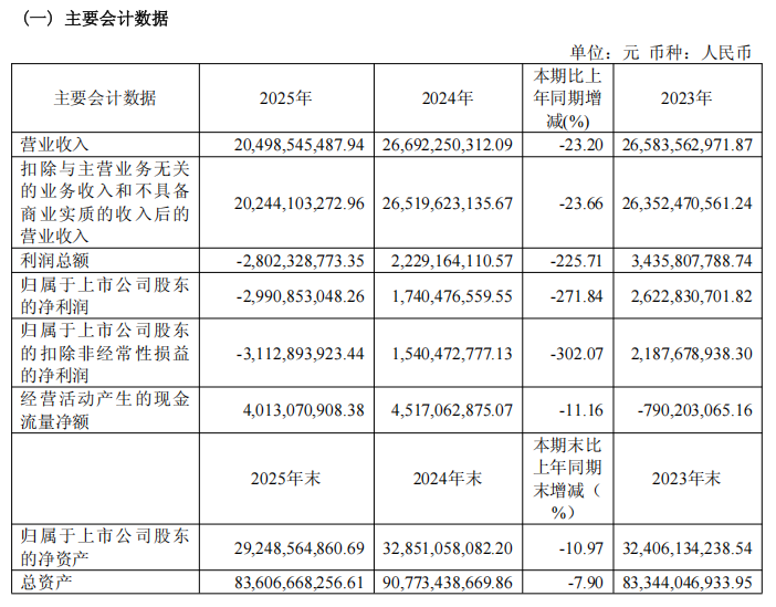 2025年,合盛硅业营收204.9854亿元,同比减少23.20%;归属于上市公司股东的扣除非经常性损益的净利润-31.12亿元,同比减少302.07%;利润总额-28.02亿元。其当务之急是及时止损,为企业生存减负。