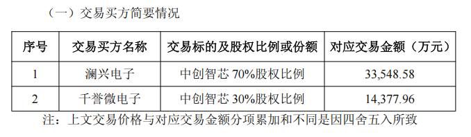 具体来看,澜兴电子将获得中创智芯70%股权,交易金额3.35亿元;千誉微电子获得中创智芯30%股权,交易金额1.43亿元,双方约定协议生效后15个工作日内一次性付清全部款项,工商变更同步推进。