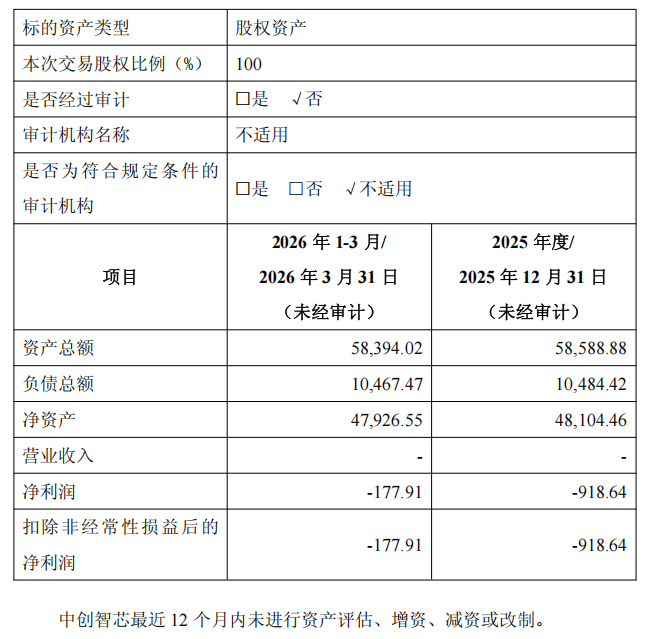 公告数据显示,2025年中创智芯净利润亏损918.64万元,2026年一季度亏损177.91万元;截至2026年3月31日(未经审计),其资产总额5.84亿元、负债总额1.05亿元、净资产4.79亿元,这也是本次交易的定价基准。