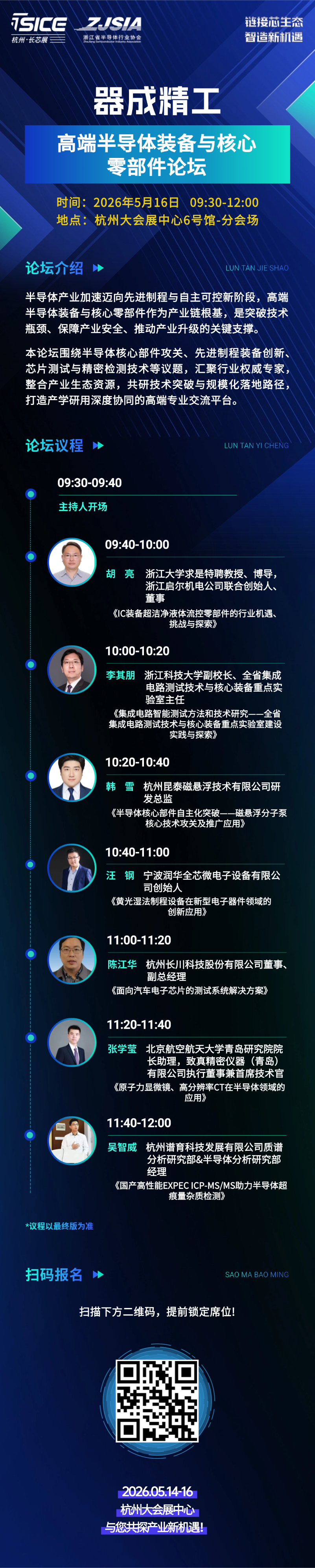 【长芯展】器成精工——高端半导体装备与核心零部件论坛重磅定档! 作者: 爱集微 1小时前 相关舆情 AI解读 生成海报 来源:浙江省半导体行业协会 #半导体# #论坛# 评论 收藏 点赞 1063 责编: 爱集微 来源:浙江省半导体行业协会 #半导体# #论坛# 收藏 点赞 分享至: 微信扫一扫分享 THE END 相关推荐 三佳科技2026年Q1营收增47.48%,净利润扭亏为盈 【凌光快讯】SEMI 中国总裁冯莉拜访凌光红外 共推半导体检测设备国产化创新 扬杰科技被欧盟列入制裁名单,2025年欧盟营收占比3.58%,积极应对消除误解 精智达2026年度向特定对象发行股票,已具备实质条件待审核注册 江化微2025年度内控有效,下一年度将继续完善内控管理 艾森股份发布薪酬考核制度,激励高管与公司共发展 +关注 爱集微 微信: 邮箱:laoyaoba@gmail.com 13.1w文章总数 12012.5w总浏览量 最近发布 MCU与蓝牙优势融合,少外围、长续航、低功耗无线SoC亮相蓝牙亚洲大会 21分钟前 纳芯微携汽车电子一站式解决方案亮相2026北京车展 32分钟前 新政落地!首次明确“实行政府投资项目决策终身负责制” 36分钟前 【长芯展】器成精工——高端半导体装备与核心零部件论坛重磅定档! 1小时前 【凌光快讯】SEMI 中国总裁冯莉拜访凌光红外 共推半导体检测设备国产化创新 2小时前 获取更多内容 最新资讯 0.9秒破百!追觅硅谷发布会首日:火箭车携6大关键技术震撼登场 19分钟前 北京车展专访|爱芯元智创始人、董事长仇肖莘博士:解读智驾产业发展“芯”路径 6小时前 MCU与蓝牙优势融合,少外围、长续航、低功耗无线SoC亮相蓝牙亚洲大会 21分钟前 教育部等五部门联合印发《“人工智能+教育”行动计划》 21分钟前 西安交大微电子学院七项研究成果在CICC 2026发布 23分钟前 北京大学电子学院蔡雪松获评2026全球6G技术与产业生态大会“6G星辰青年科学家”荣誉称号 28分钟前