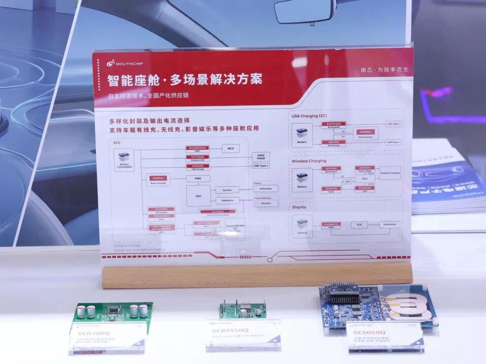 面向智能座舱应用,南芯提供多种封装及输出电流的电源产品,可支持车载有线充、无线充、影音娱乐等多种座舱应用。展台现场,南芯带来了最新支持 48V 汽车系统的通用 DC-DC,以及有线充及无线充产品。