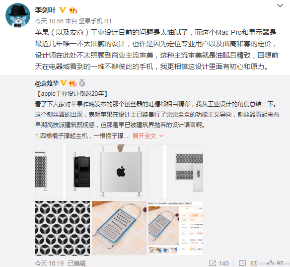 对于袁炫华的吐槽,锤子前设计师李剑叶持相反的观点,他盛赞新版Mac Pro是苹果最近几年唯一不太油腻的设计,也许是因为定位专业用户以及曲高和寡的定价,设计师在此处不太照顾到商业主流审美,这种主流审美就是油腻且精致。