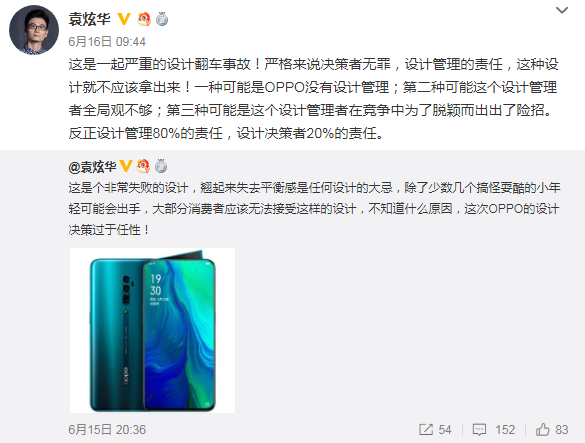 袁炫华进一步分析说OPPO Reno系列的设计是一起严重的设计翻车事故!严格来说决策者无罪,设计管理的责任,这种设计就不应该拿出来!一种可能是OPPO没有设计管理;第二种可能这个设计管理者全局观不够;第三种可能是这个设计管理者在竞争中为了脱颖而出出了险招。反正设计管理80%的责任,设计决策者20%的责任。