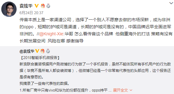 “传音本质上是一家渠道公司,选择了一个别人不愿意去做的市场深耕,成为非洲的OPPO,短期的护城河是渠道,长期的护城河是没有的,中国品牌迟早全面进军非洲的。”