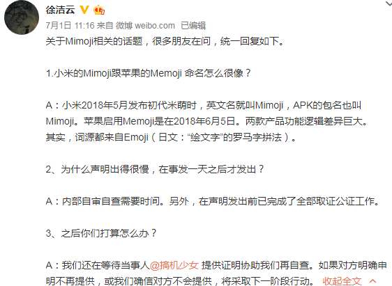 面对质疑,小米方面进行了否认,官方称小米2018年5月发布初代米萌时,英文名就叫Mimoji,APK的包名也叫Mimoji。苹果启用Memoji是在2018年6月5日。两款产品功能逻辑差异巨大。