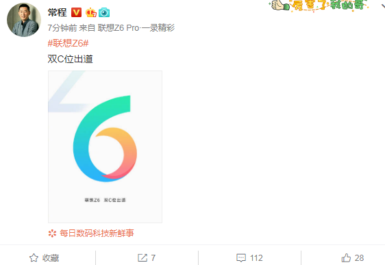 有意思的是被小米赋予深意的CC系列被联想集团副总裁常程碰瓷了,在他的一条微博中,配图将两个字母“C”奇迹般的拼成了数字6,用的颜色跟小米CC系列的宣传海报异曲同工,字母“Z”则是若隐若现,常程说联想Z6双C位出道。