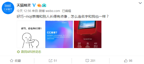 很快在7月2日,小米的上述两件事物被天猫精灵官方微博拿过来调侃了,它说:“好巧~moji表情和别人长得有点像,怎么连名字和我也一样?”。
