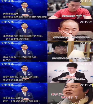 2016年,罗振宇表示满桌人没有一个人看好罗永浩,除了自己,结果到了2019年,罗永浩转做电子烟,手机业务贱卖。