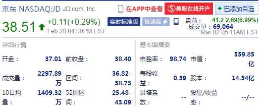 北京时间3月2日消息,京东股价盘前涨约7%;2019年第四季度营收、净利润均优于市场预期,且预计今年第一季度营收至少涨10%。