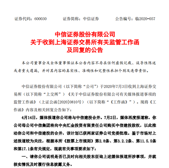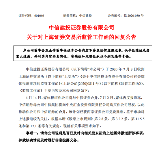 根据上交所7月3日监管函,今年4月14日,媒体报道中信证券将与中信建投合并。7月2日,媒体再度报道称,中信证券母公司中信集团将向中信建投主要股东中央汇金购买中信建投股权,以此推动中信证券和中信建投的合并,该计划已获两家证券公司党委批准。