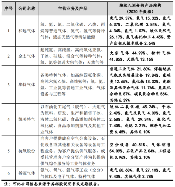 通过对比和远气体、金宏气体、华特气体等企业的产品类型来看,侨源气体主要产品局限于氮气、氧气、氩气,产品类型较为单一。