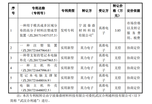 上述转让中,转让方宁波秦鼎材料科技有限公司并非发行人的关联方,故其向真准电子转让一项发明专利不构成关联交易。因真准电子为英力电子全资子公司,故英力电子向真准电子无偿转让5项实用新型专利不构成合并层面的关联交易,无须按照关联交易进行认定和披露。
