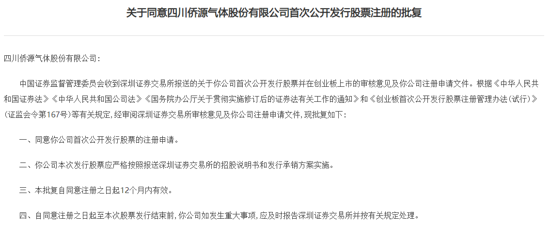 近日,证监会发布关于同意四川侨源气体股份有限公司(简称:侨源气体)首次公开发行股票注册的批复,同意侨源气体首次公开发行股票的注册申请。