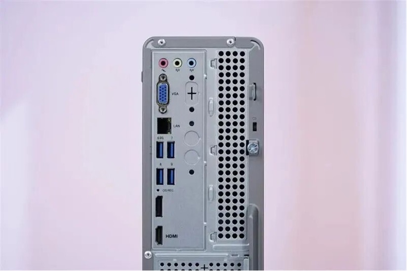 左边是I/O接口,从上到下依次是3x3.5音频接口、VGA接口、千兆网口、4x5Gbps USB-A接口、DP和HDMI接口。