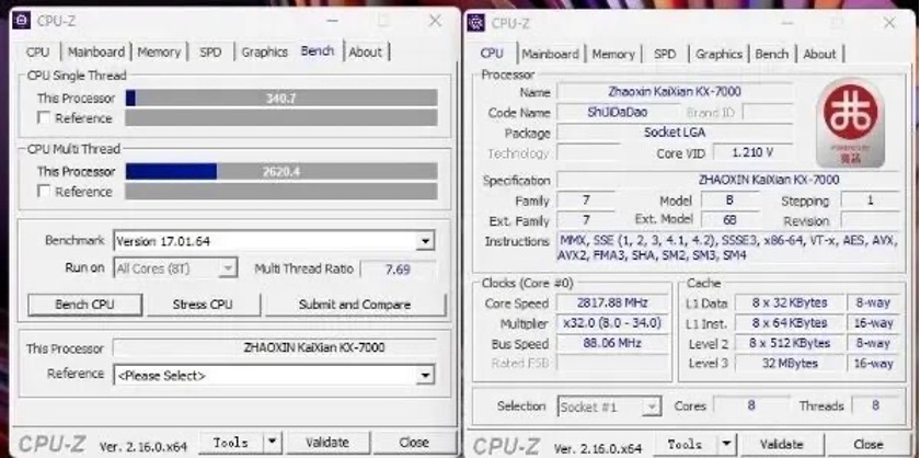 在CPU-Z中能看到兆芯KX-7000的一些详细参数,8核心8线程、768KB一级缓存、4MB二级缓存、32MB三级缓存。