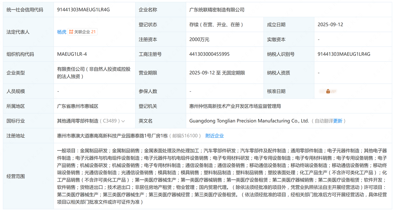 集微网消息(文/罗叶馨梅)近日,企查查APP显示,统联精密全资设立广东统联精密制造有限公司,注册资本2000万元,法定代表人为杨虎。经营范围包括金属制品研发与销售、汽车零部件研发、电子元器件制造、电子专用材料研发等。