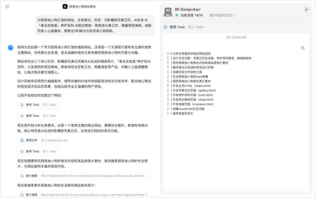 该模式的实际应用能力在几个关键场景中得到了展示。最引人注目的是端到端的网站原型开发。用户仅需用自然语言描述需求,Kimi便能自主完成从需求分析、任务规划、素材搜集、交互设计、前后端代码编写,直至最终将网站部署到云端服务器的全过程。在官方演示中,Kimi为一只宠物狗创建多功能网站时,自主规划了14个子任务,并在部署环节自行解决了端口占用的问题,展现了其处理突发状况的能力。