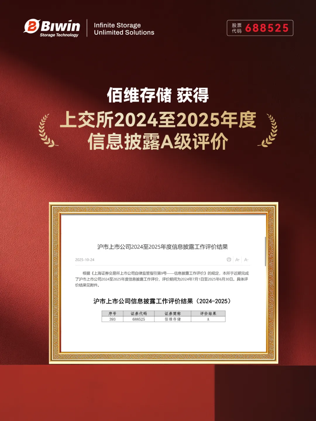近日,上交所公布沪市主板上市公司2024-2025年度信息披露工作评价结果,佰维存储获得信息披露评价A级,标志着监管机构对公司规范化运营和高质量信息披露工作的充分肯定。