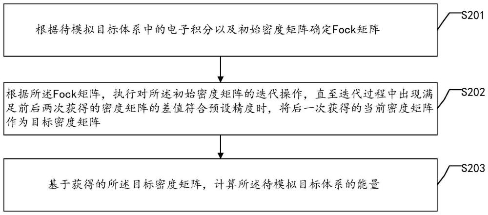 本发明公开了一种目标体系能量的计算方法、装置及存储介质,方法包括:首先根据待模拟目标体系中的电子积分以及初始密度矩阵确定Fock矩阵,然后根据Fock矩阵,执行对初始密度矩阵的迭代操作,直至迭代过程中出现满足前后两次获得的密度矩阵的差值符合预设精度时,将后一次获得的当前密度矩阵作为目标密度矩阵,最后基于获得的目标密度矩阵,计算待模拟目标体系的能量,它通过确定目标密度矩阵,由此计算得到目标体系能量,使得目标体系能量的计算精度提高,适用于复杂体系的量子计算模拟,进一步促进量子化学模拟应用的发展。