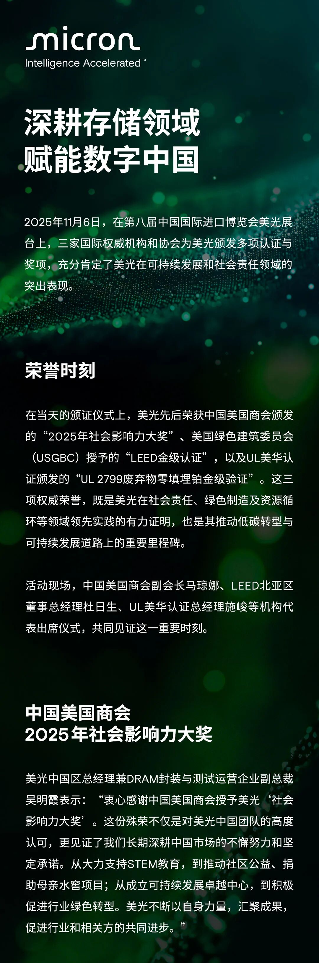 从社会影响力到绿色制造,美光进博再获三项殊荣 作者: 爱集微 11-06 20:56 相关舆情 AI解读 生成海报 来源:Micron美光科技 #美光科技# 评论 收藏 点赞 1.6w 责编: 爱集微 来源:Micron美光科技 #美光科技# 收藏 点赞 分享至: 微信扫一扫分享 THE END 相关推荐 英伟达大单“点燃”HBM涨价行情,存储板块再爆发 高容量,低功耗!美光SOCAMM2模组正式送样 美光G9 NAND首秀:三款SSD锁定AI算力痛点 美光出货全球首款基于1γ制程节点的LPDDR5X内存,赋能移动AI应用 美光执行副总裁兼首席财务官慕飞一行拜会陕西省副省长陈春江 美光科技:1γ制程节点为什么能带来跨越代际的引导力 +关注 爱集微 微信: 邮箱:laoyaoba@gmail.com 12.1w文章总数 12012.5w总浏览量 最近发布 12月19日!摩尔线程将重磅发布新一代GPU架构 12-09 09:58 迈斯拓扑完成新一轮融资,推动新型医用同位素国产商业化进程 2小时前 国芯科技携手中云信安打造新一代金融POS机芯片,为金融打造抗量子密码安全底座 3小时前 为摆脱依赖,美国在非洲“落子” 5小时前 机构预测:到2029年仅5%车企坚持投入AI 5小时前 获取更多内容 最新资讯 兴福电子拟收购三峡实验室光刻胶核心资产,评估价值4626.78万元 47分钟前 设备采购周期延长,天赐材料4.1万吨锂材项目再延期 52分钟前 12月19日!摩尔线程将重磅发布新一代GPU架构 12-09 09:58 长江存储同日起诉美国国防部、商务部 3小时前 从战略使命到集群引擎:江城产业投资基金竞逐“IC风云榜”年度最佳投资机构奖 1小时前 从“补短板”到“建生态”:安芯投资十年一剑绘制半导体产业全景图 1小时前