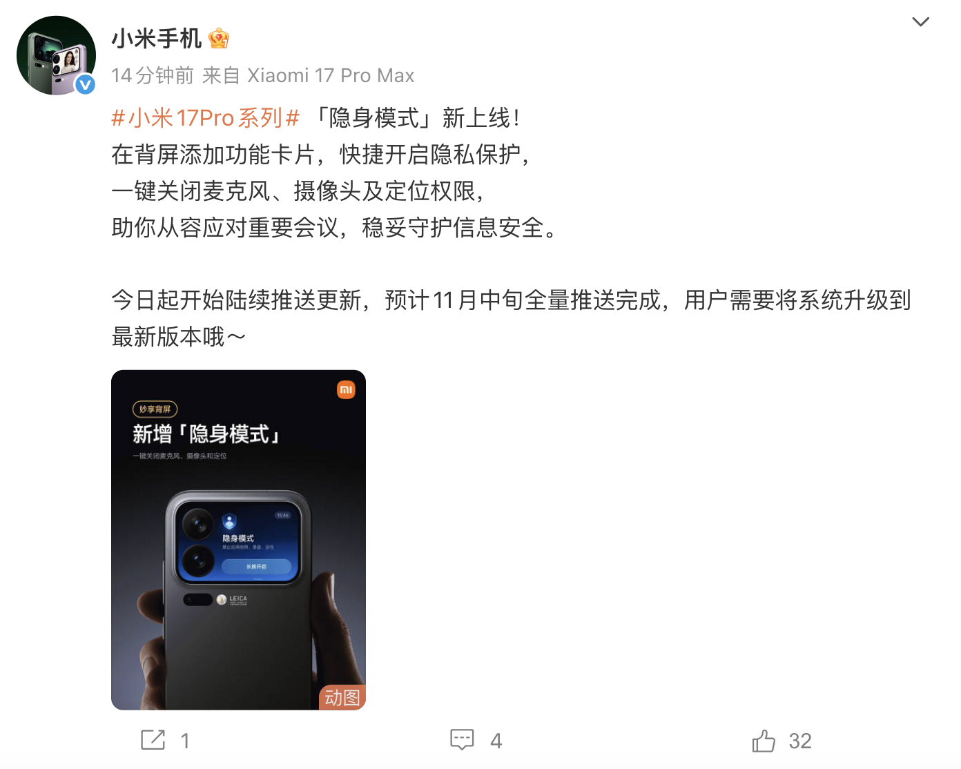 11月5日,小米手机官方宣布,小米17 Pro系列“隐身模式”今日起陆续推送更新,预计11月中旬全量推送完成,用户需将系统升级至最新版本。据官方介绍,用户可在背屏添加功能卡片,快捷开启隐私保护,一键关闭麦克风、摄像头及定位权限。