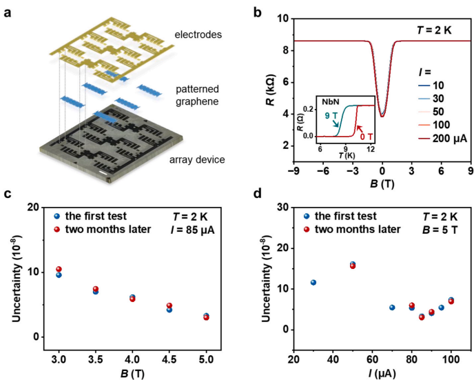 为揭示其物理机制,研究团队结合输运测量与ARPES,发现器件尺寸变化会引致石墨烯能带结构的细微重整化。费米速度测量进一步证实,电子-电子相互作用与尺寸效应共同改变了狄拉克锥形状,从而引起载流子密度随尺寸变化。基于此规律,团队采用支持向量回归(SVR)机器学习模型,对沟道宽度等参数进行协同优化,确定约360 μm为电阻不确定度与集成密度间的最佳平衡点。据此成功制备输出量值为8.604 kΩ的量子霍尔电阻阵列,该阵列在约±1.5 T磁场下即可进入量子化平台,并于85 μA电流下达到3.0×10⁻⁸的最低不确定度。该工作揭示了石墨烯量子霍尔器件中载流子密度的显著尺寸依赖效应,为高性能、多量值的量子电阻器件设计提供了关键依据。值得一提的是,该团队在《功能材料与器件学报》近期发表的综述(量子电阻研究进展,1007-4252(2025)05-0001-13)中也指出,通过调研不同关于石墨烯基量子电阻的研究论文中器件尺寸与完全量子化所需磁场关系,并作统计发现:量子化磁场随器件尺寸增加而减小,该调研结果随进一步佐证了本工作的发现。