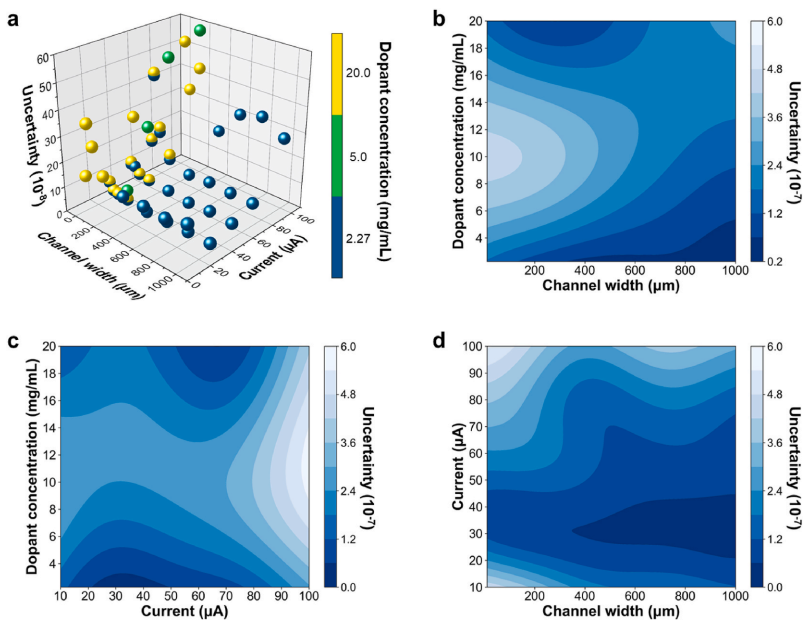 图2 、基于机器学习SVR模型预测的器件不确定度与掺杂浓度、电流、沟道宽度之间的关系图。