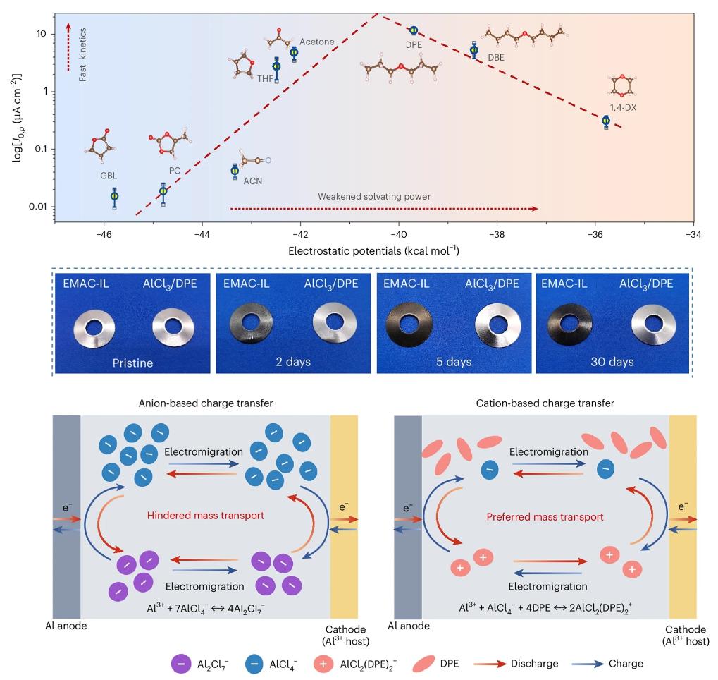 项目团队开创性提出“有机双氯”溶剂化电解液设计策略,以氯化铝/正丙醚有机体系替代传统离子液体,通过精确调控溶剂化结构,将腐蚀性氯离子“限域”在铝离子周围,显著降低腐蚀性的同时提升电化学可逆性。