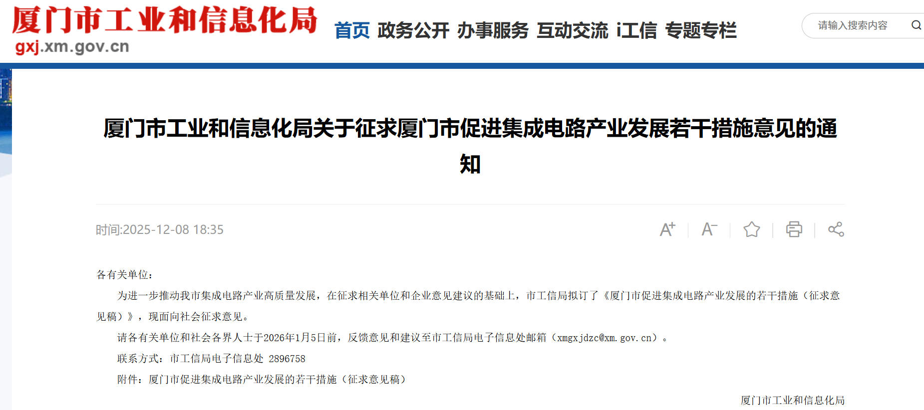 12月8日,厦门市工业和信息化局官网发布《厦门市促进集成电路产业发展的若干措施(征求意见稿)》,面向社会征求意见,截至日期为2026年1月5日前。