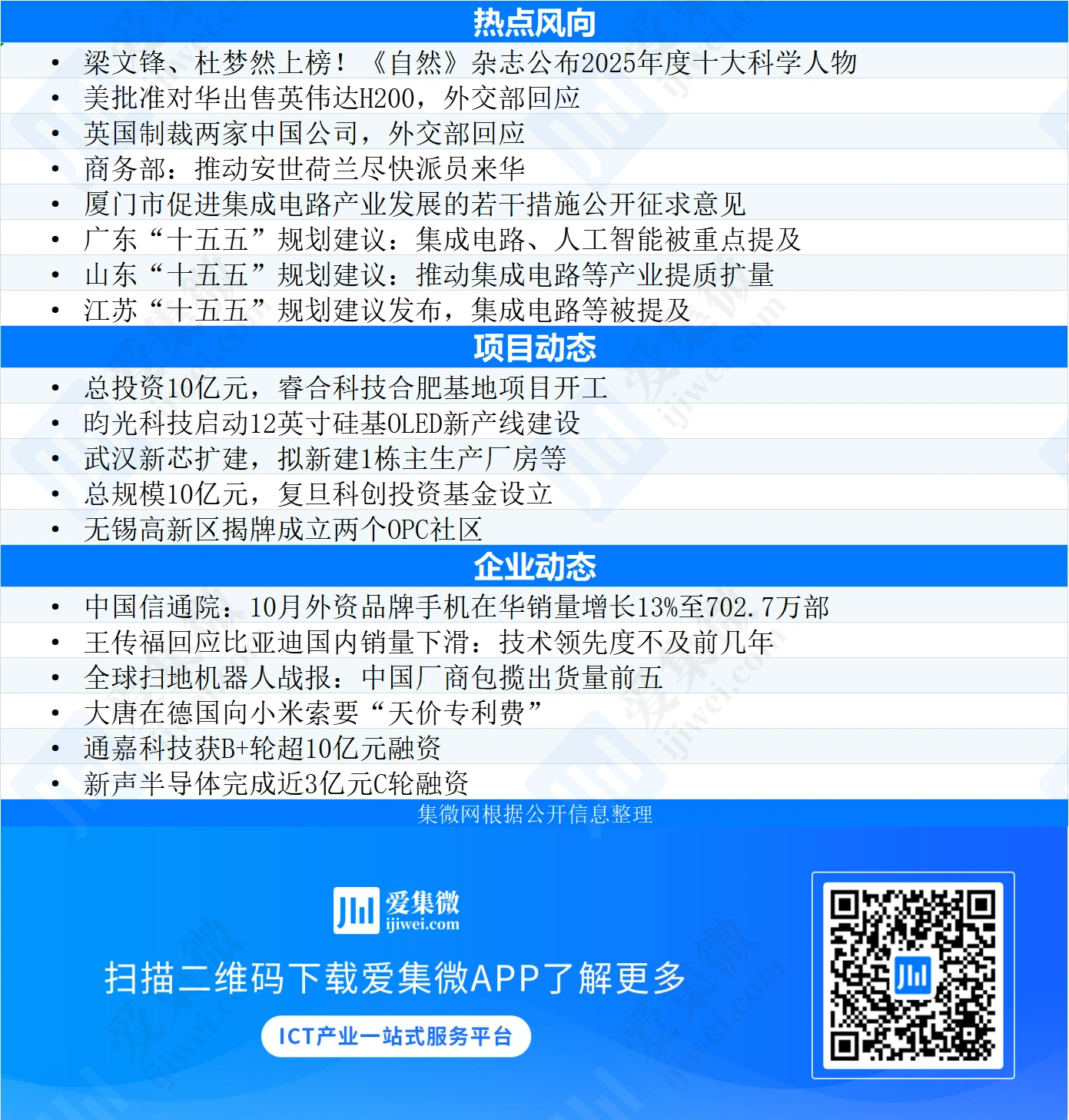 本周以来,外交部回应美批准对华出售英伟达H200相关事宜;多地“十五五”规划建议发布;王传福回应比亚迪国内销量下滑;昀光科技启动12英寸硅基OLED新产线建设;大唐在德国向小米索要“天价专利费”……