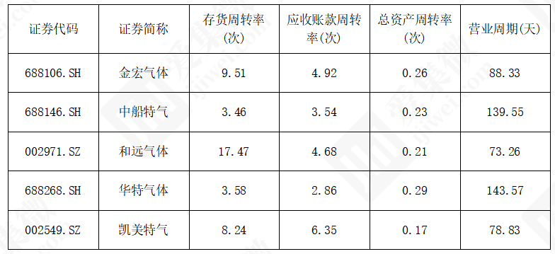 和远气体存货周转率 17.47 次大幅领跑,中船特气与华特气体不足 3.6 次;凯美特气应收账款周转率 6.35 次回款最优,华特气体 2.86 次资金回笼承压;总资产周转率中华特气体 0.29 次效率最高,凯美特气 0.17 次垫底;营业周期上,和远气体 73.26 天最顺畅,华特气体与中船特气均超 139 天,资金占用时间较长。