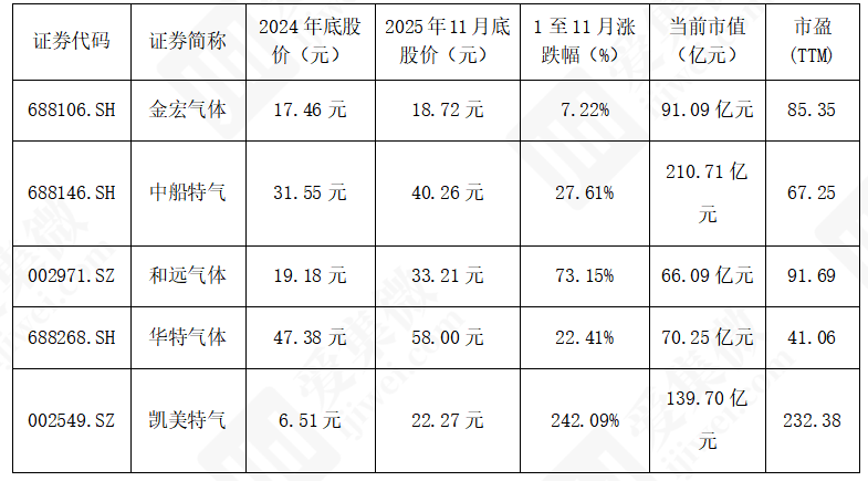 2025 年 1-11 月,五家公司股价均上涨,凯美特气涨幅 242.09% 断层领先,和远气体(73.15%)、中船特气(27.61%)紧随其后,金宏气体(7.22%)与华特气体(22.41%)涨幅温和。股价上涨核心逻辑包括业绩修复(金宏气体、华特气体)、业务布局落地(和远气体)、行业复苏与技术优势(中船特气)及赛道红利(凯美特气)。
