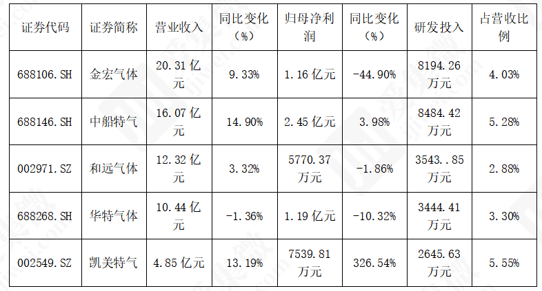 在中国半导体电子特气上市公司数据方面,《报告》金宏气体、华特气体、中船特气、和远气体、凯美特气五家上市企业为样本,构建了多方位对标体系。