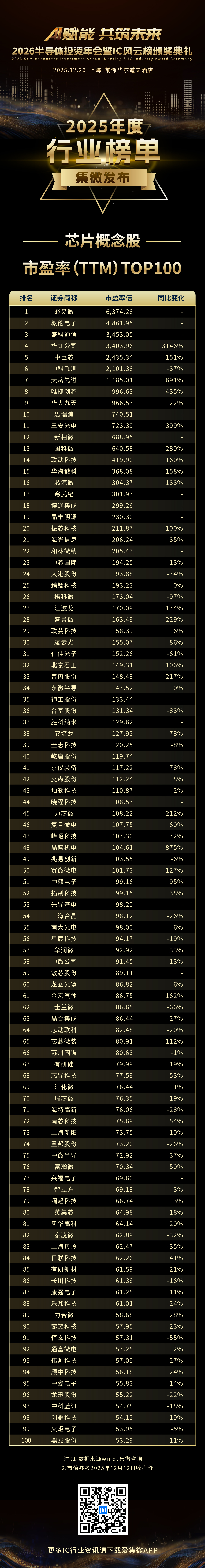 此为“芯片概念股”系列榜单之《中国芯·芯片概念股——市盈率(TTM)TOP100》。