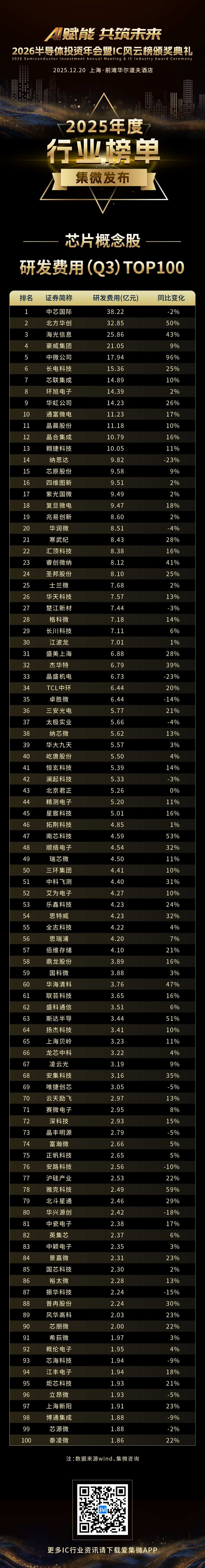 此为“芯片概念股”系列榜单之《中国芯·芯片概念股——研发费用(Q3)TOP100》。