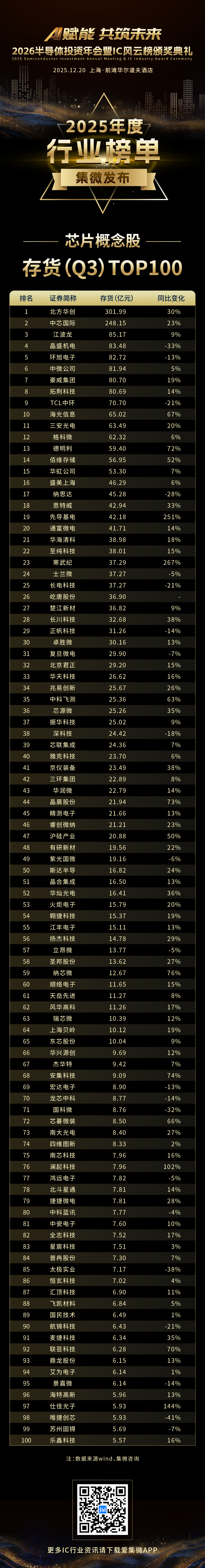 此为“芯片概念股”系列榜单之《中国芯·芯片概念股——存货(Q3)TOP100》。