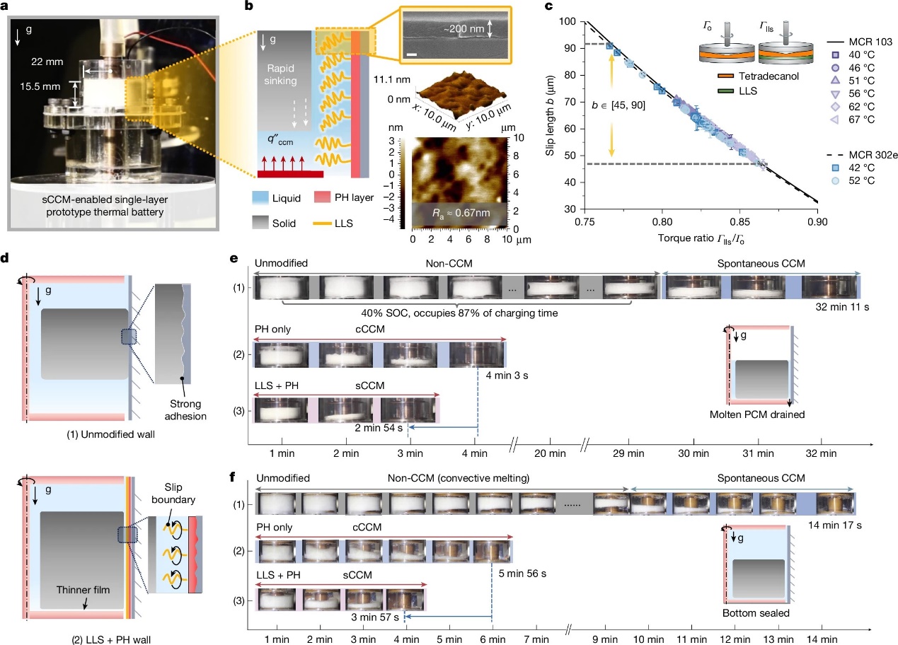 团队另辟蹊径,瞄准了“接触式传热”这个关键。他们给热池内壁做了层超滑处理,让固态的相变材料不粘壁,靠自身重力一直紧贴底部热源,近距离接受不断传来的热量,使“热池”全程保持高传热速率。该方法不依赖特殊的相变材料,只通过优化相变热池内壁环境实现高效传热。